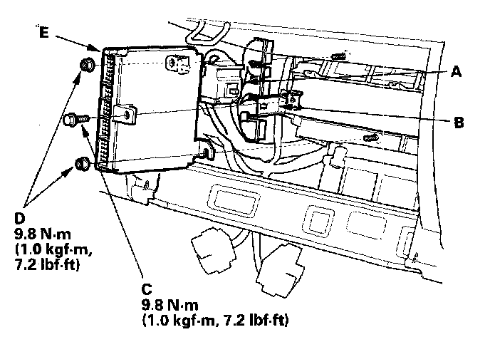 12. Remove the nuts (D),then remove the ECM/PCM (E).