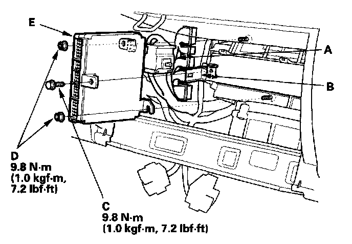 12. Remove the nuts (D),then remove the ECM/PCM (E).
