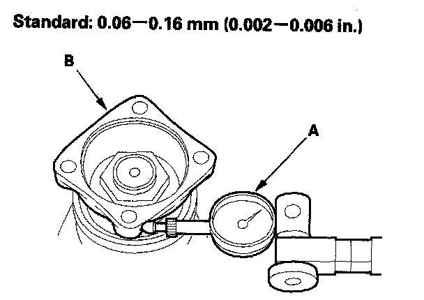 14. Set a dial indicator (A) on the companion flange (B), then measure the transfer gear backlash.