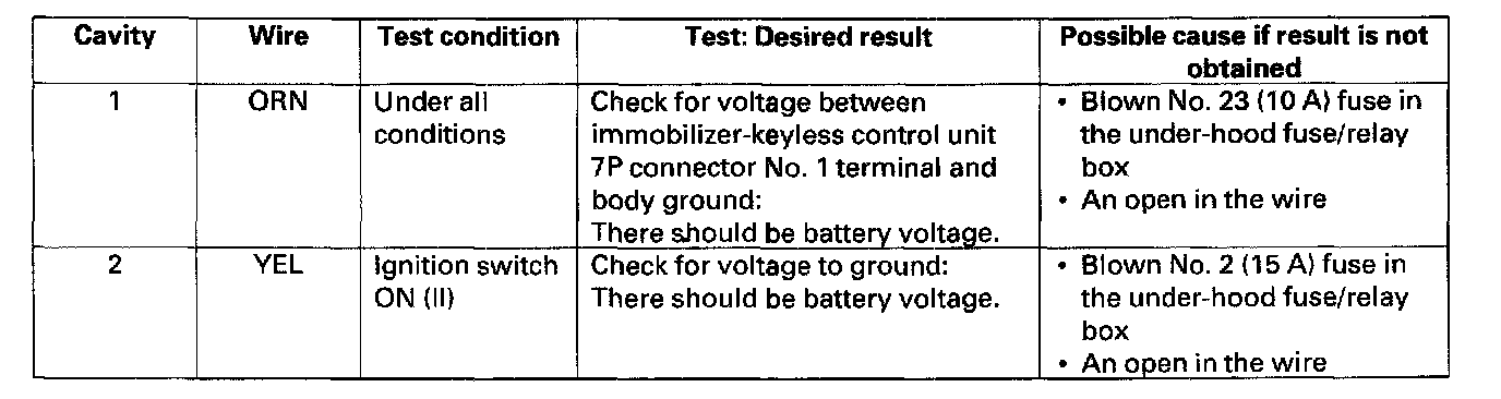 Immobilizer-keyless Control Unit Input TestNOTE: Before troubleshooting the immobilizer system, troubleshoot the B-CAN System Diagnosis Test Mode A, and check the No. 10 (7.5 A) and No. 38 (30 A) fuses in the under-dash fuse/relay box.