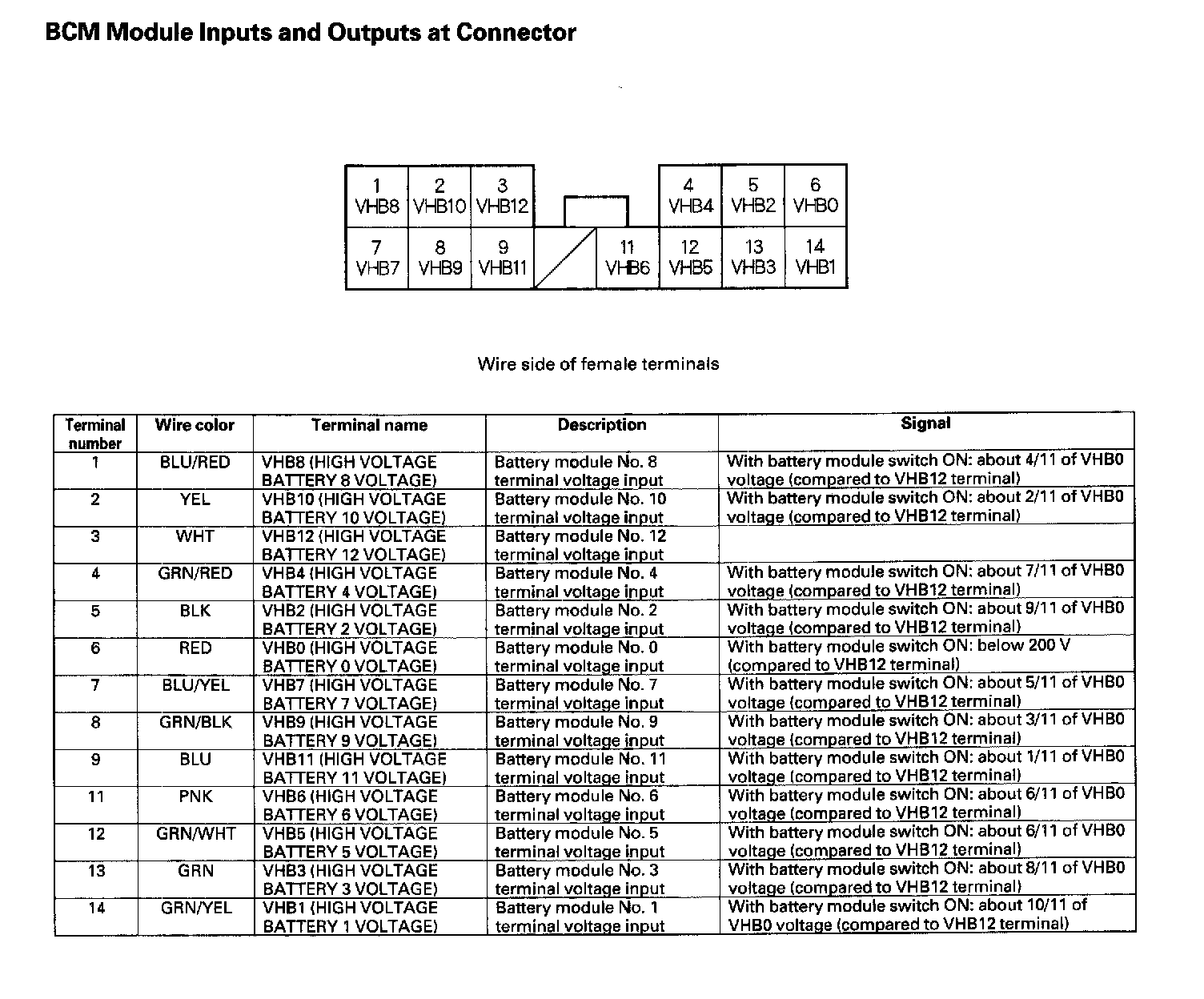 BCM Module Inputs and Outputs at Connector: