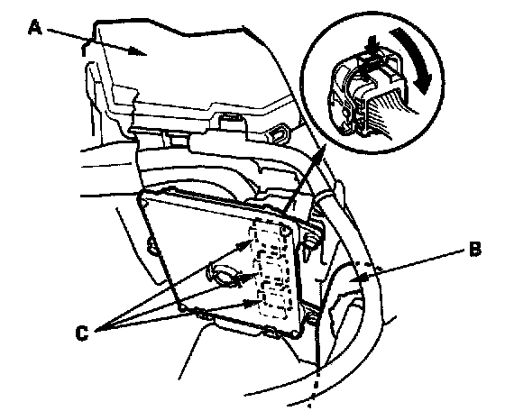4. Remove the expansion tank (B). Disconnect the PCM connectors (C), and probe the terminals from the terminal side of the connectors.