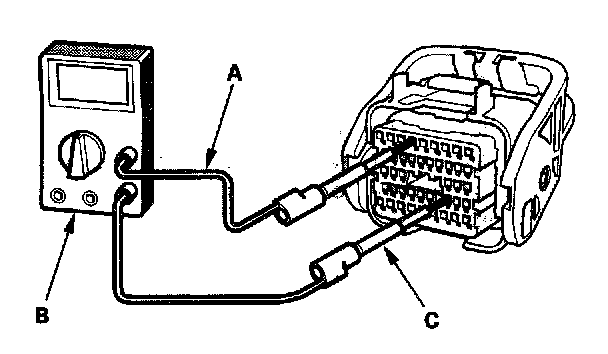 6. Connect one side of the patch cord (A) terminals to a commercially available digital MultiMate (B), and connect the other side of the patch cord terminals to a commercially available banana jack (Pomona Electronics Tool No. 3563 or equivalent) (C).