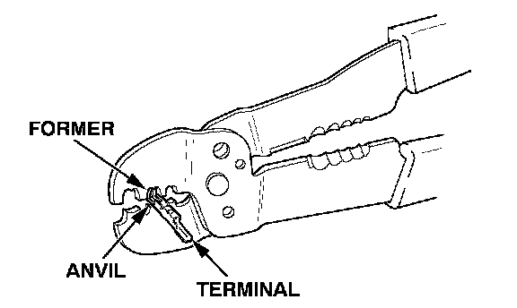 4. Position the terminal in the crimping tool slot with the solid portion of the terminal toward the anvil and the open section toward the former.