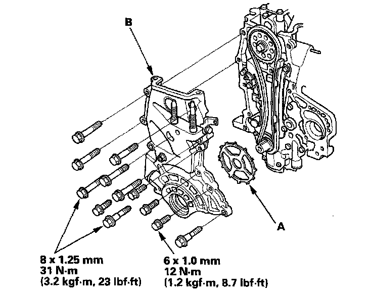 ^ 2 Mark the bolt head (D) and the crankshaft pulley (E) as shown, then tighten the bolt an additional 90° (The mark on the bolt head line up with the mark on the crankshaft pulley).
