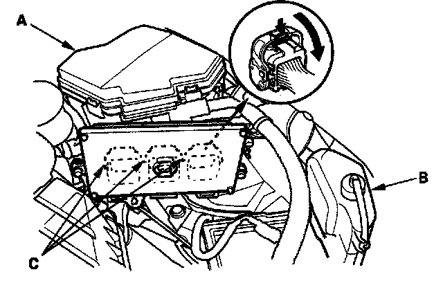 4. Remove the expansion tank (B). Disconnect the PCM connectors (C), and probe the terminals from the terminal side of the connectors.