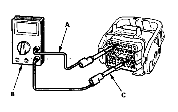 6. Connect one side of the patch cord (A) terminals to a commercially available digital multimeter (B), and connect the other side of the patch cord terminals to a commercially available banana jack (Pomona Electronics Tool No. 3563 or equivalent) (C).