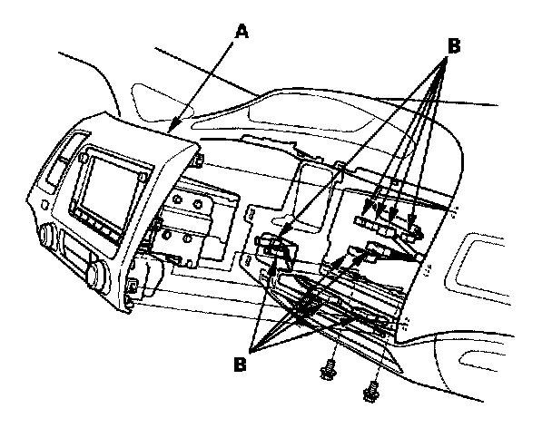 5. Remove the screws, brackets (A), and the navigation unit (B) from the center panel (C).