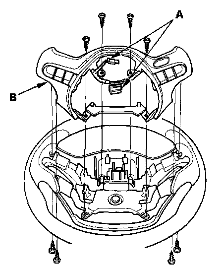 2. Disconnect the connectors (A), then remove the steering wheel trim (B).