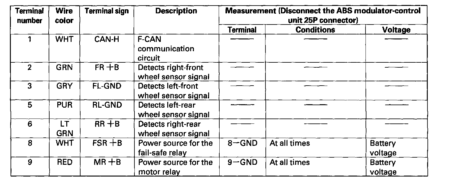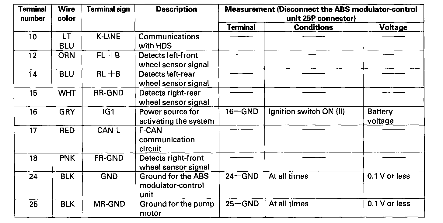 ABS Modulator-Control Unit Inputs and Outputs for 25P Connector: