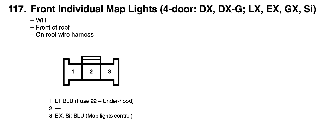 117. Front Individual Map Lights (4-door: DX, DX-G; LX, EX, GX, Si):
