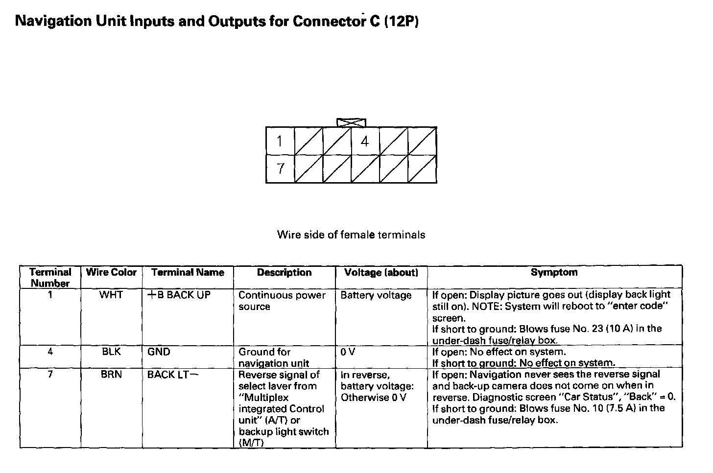 Navigation Unit Inputs And Outputs For Connector C (12P):