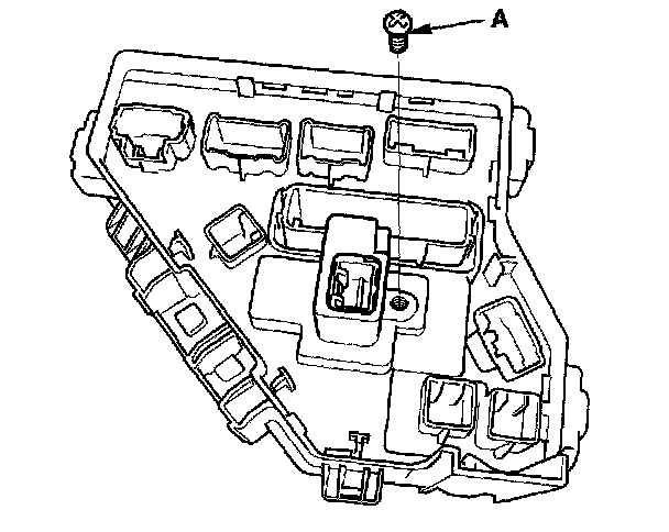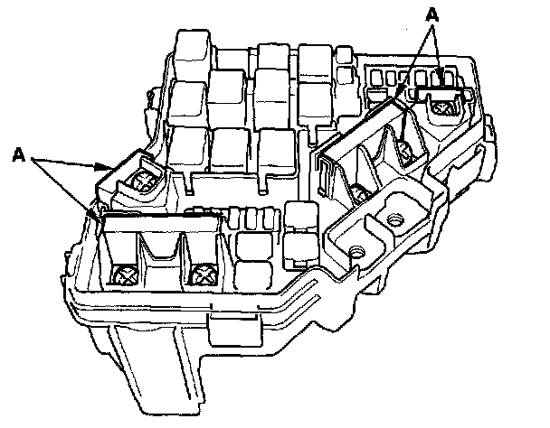 4. Using two flat-tip screwdrivers, release the tabs (A), and pry up the fuse/relay box base (B) from the fuse/relay box housing (C).