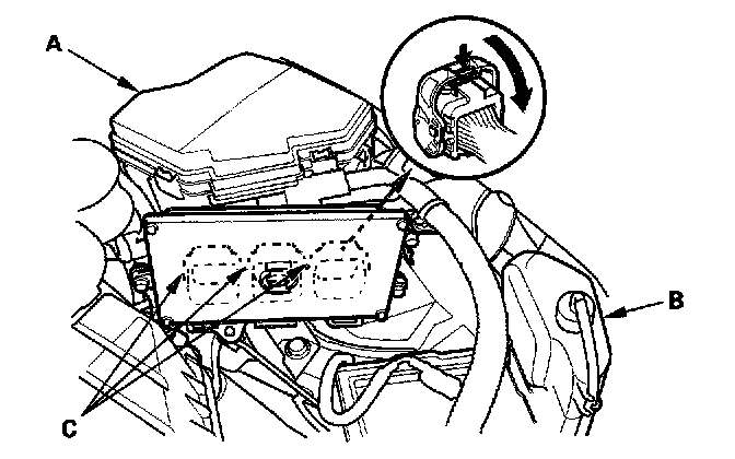 4. Remove the expansion tank (B). Disconnect the ECM/PCM connectors (C), and probe the terminals from the terminal side of the connectors.