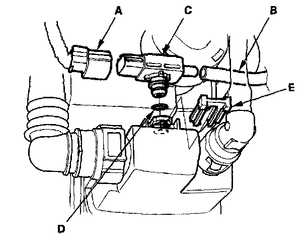 4. Install the sensor in the reverse order of removal with a new O-ring (D) and a new retainer (E).