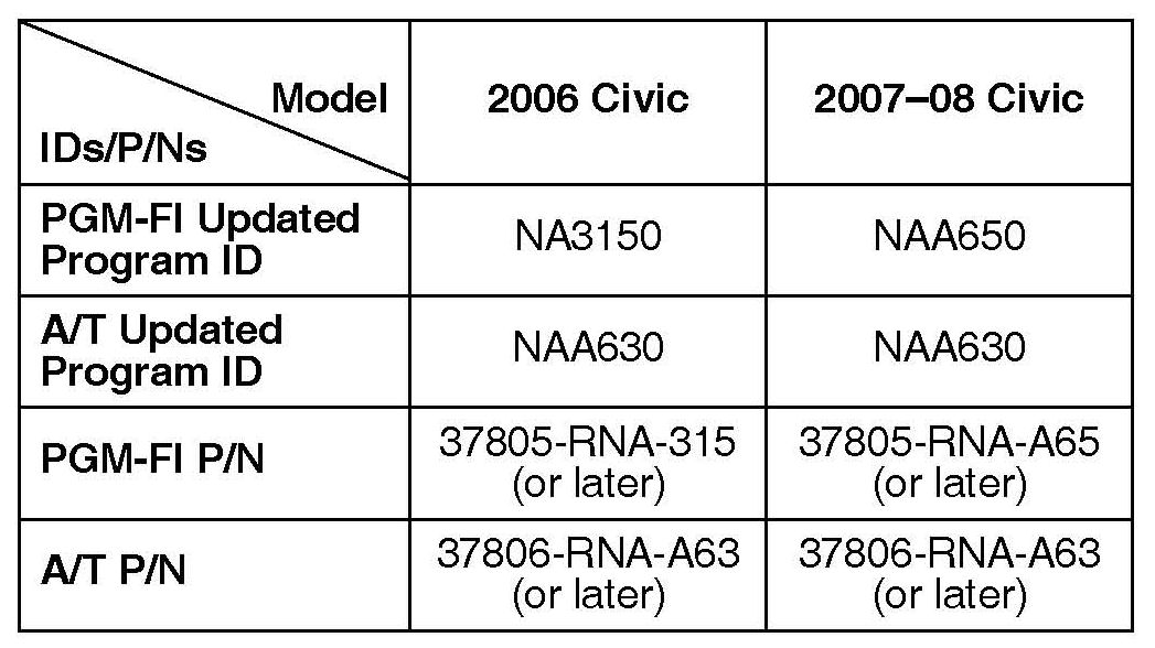 Home >> Honda >> 2006 >> Civic L4-1.8L >> Repair and Diagnosis >> Powertrain Management >> Computers and Control Systems >> Relays and Modules - Computers and Control Systems >> Engine Control Module >> Technical Service Bulletins >> All Technical Service Bulletins >> A/T, Engine Controls - Update ECM When A/T Replaced