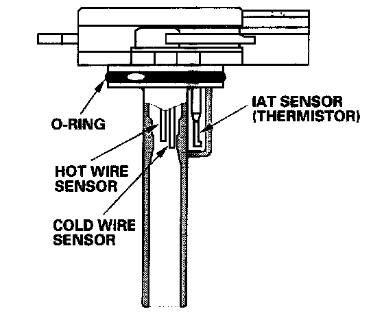 The mass airflow (MAF) sensor/intake air temperature (IAT) sensor contains a hot wire and a thermistor. It is located in the intake air passage. The resistance of the hot wire and thermistor change due to intake air temperature and air flow. The control circuit in the MAF sensor controls the current to keep the hot wire at a set temperature. The current is converted to voltage in the control circuit, then output to the ECM.