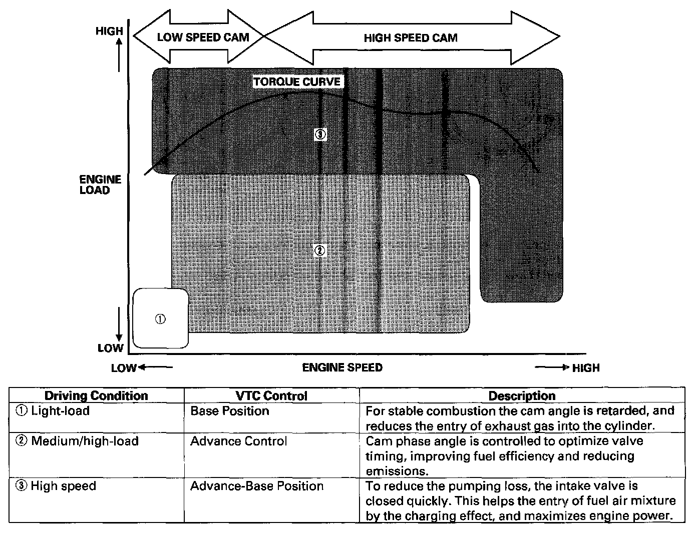 - The VTC system makes continuous intake valve timing changes based on operating conditions.