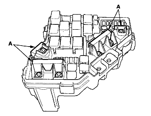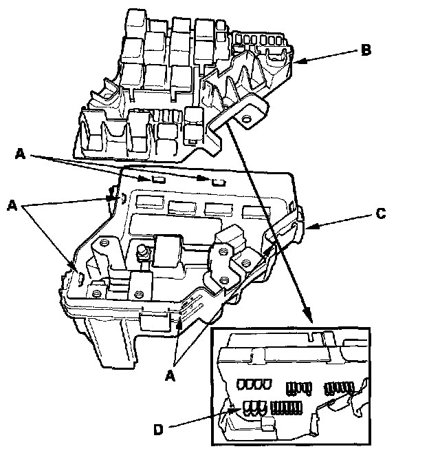 4. Using two flat-tip screwdrivers, release the tabs (A), and pry up the fuse/relay box base (B) from the fuse/relay box housing (C).