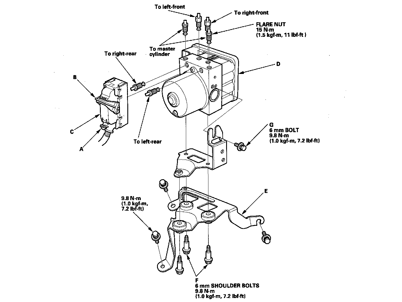 4. Remove the two 6 mm shoulder bolts (F) and 6 mm bolt (G) from the bracket, then remove the ABS modulator control unit from the bracket.