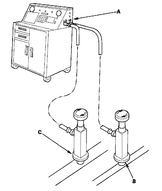 1. Connect an R-134a refrigerant recovery/recycling/charging station (A) to the high-pressure service port (B) and the low-pressure service port (C), as shown, following the equipment manufacturer's instructions.