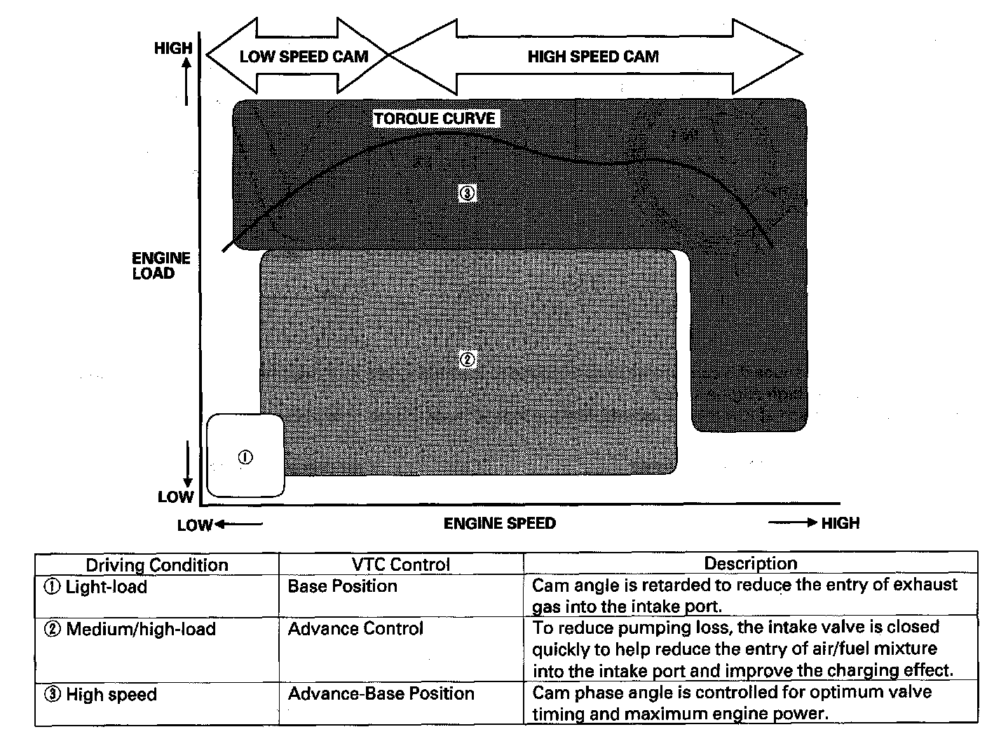 - The VTC system makes continuous intake valve timing changes based on operating conditions.