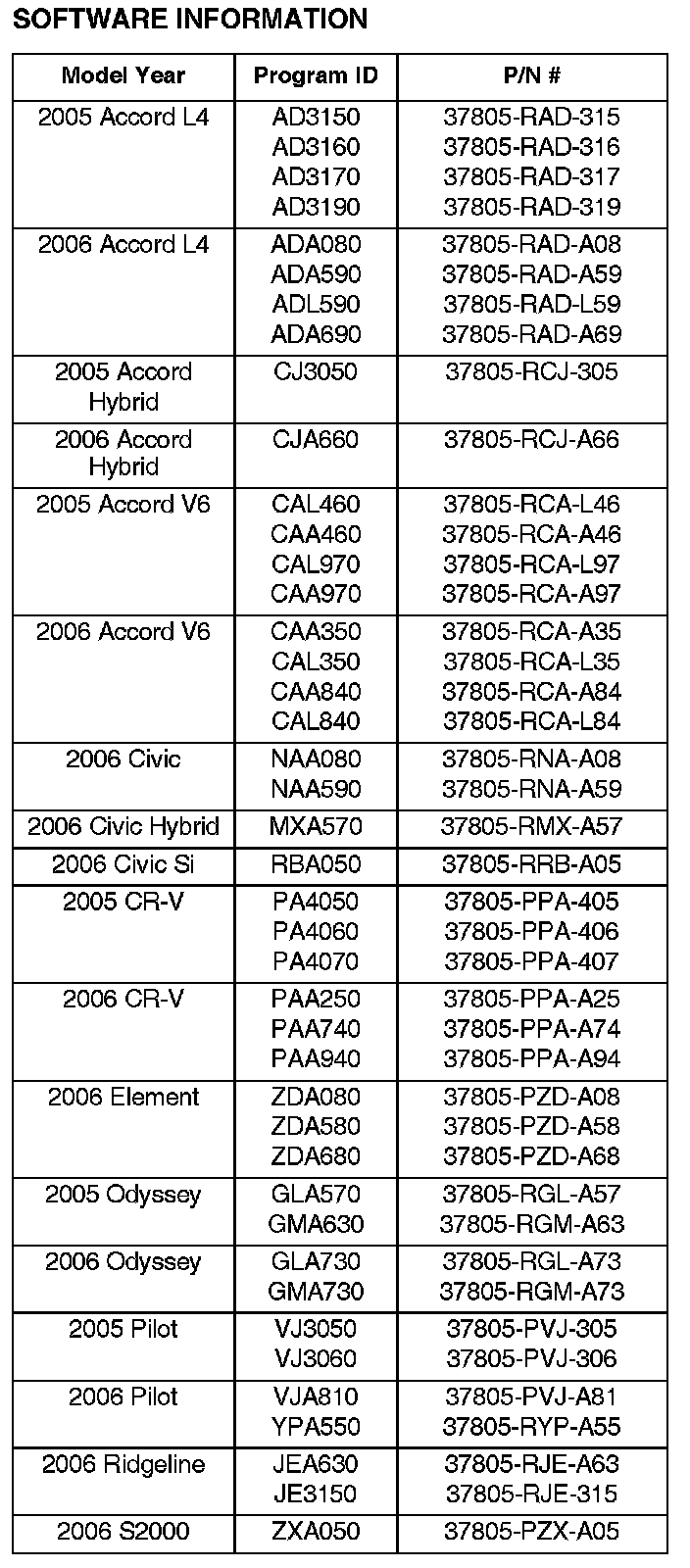 Use the HDS with software version 2.005.004 or later to update the ECM/PCM PGM-FI software. Refer to Service Bulletin 01-023, Updating the Control Units/Modules.