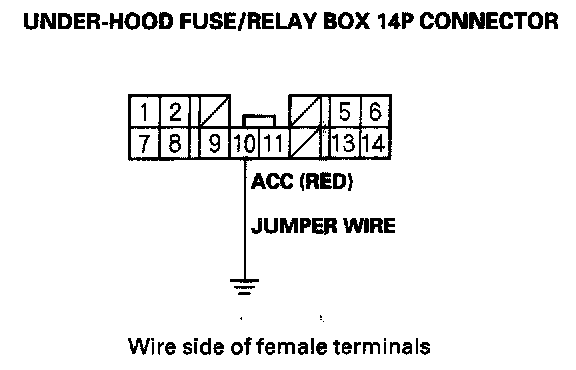 9. Momentarily connect under-hood fuse/relay box 14P connector terminal No. 10 to body ground with a jumper wire several times.