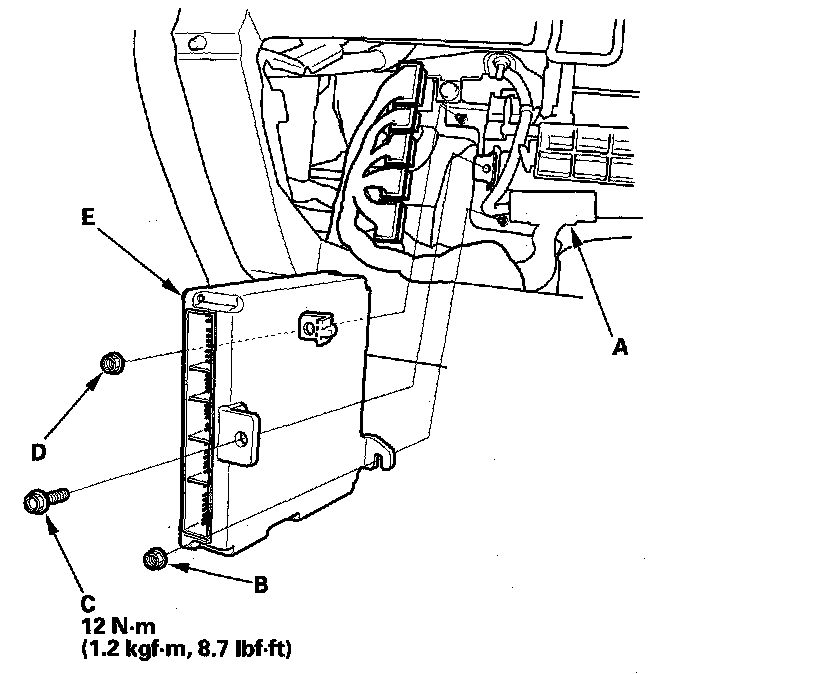 7. Loosen the PCM mounting nut (B) on the lower right of the PCM, and remove the mounting bolt (C) and nut (D) on the left of the PCM.
