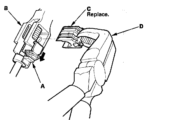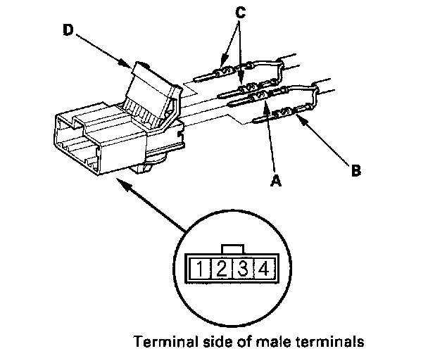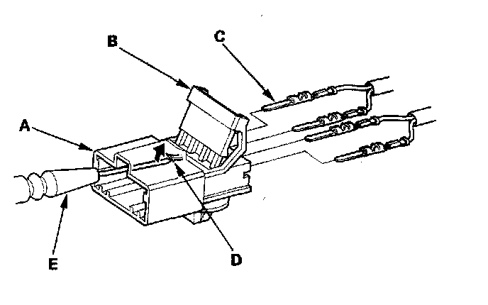 19. Remove the terminal (C) from the connector by pushing the lock tab (D) up in the connector using a thin blade screwdriver (E). Remove all four terminals.