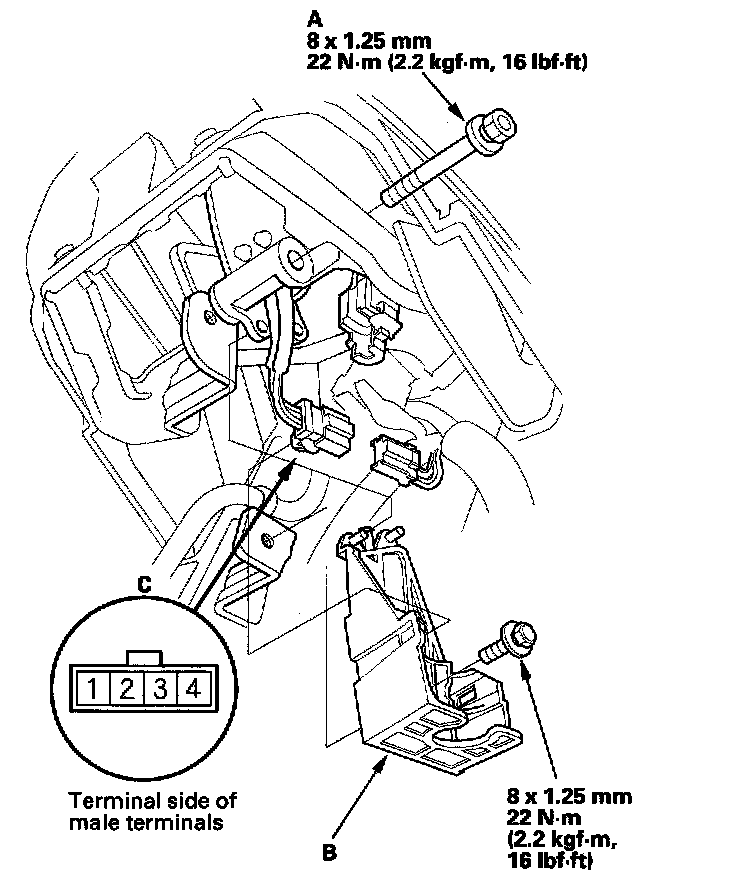 28. Install the O/D switch harness terminals (C) in the No. 1 and No. 2 cavities. Either O/D switch harness terminal can be installed in No. 1 and No. 2 cavities.