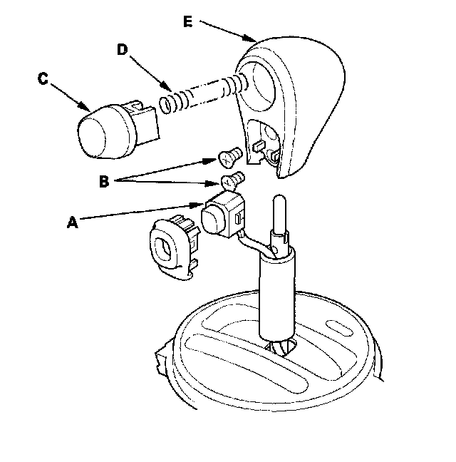 16. Remove the O/D switch (A) by expanding its locks, and remove the screws (B), shift lever button (C), spring (D), and shift lever knob (E).