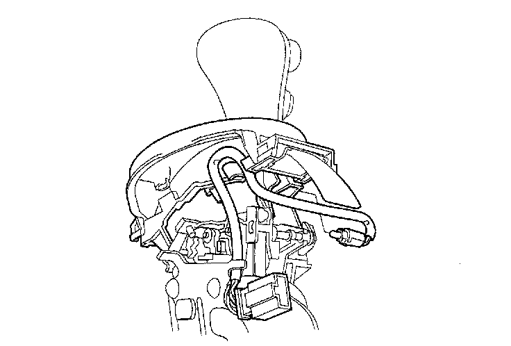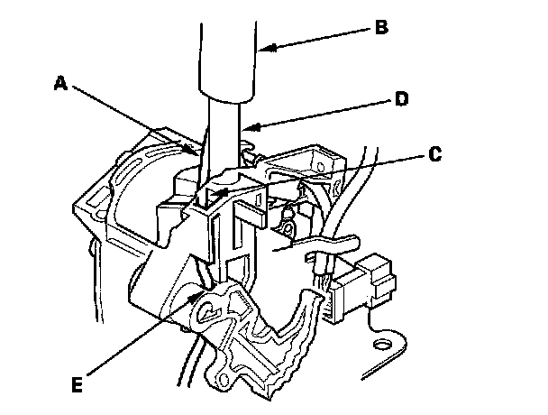 21. Insert the new O/D switch harness (A) into the shift lever ring (B), and route the harness through the groove (C) of the shift lever (D) into the hole (E). Do not pinch the harness.
