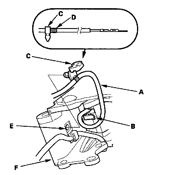 8. Rotate the socket holder (A) on the shift cable (B) a quarter turn; the tab (C) on the socket holder will be in the opening (D) of the shift cable bracket (E). Then slide the holder to remove the shift cable from the shift cable bracket. Do not remove the shift cable by twisting the shift cable guide (F) and damper (G).