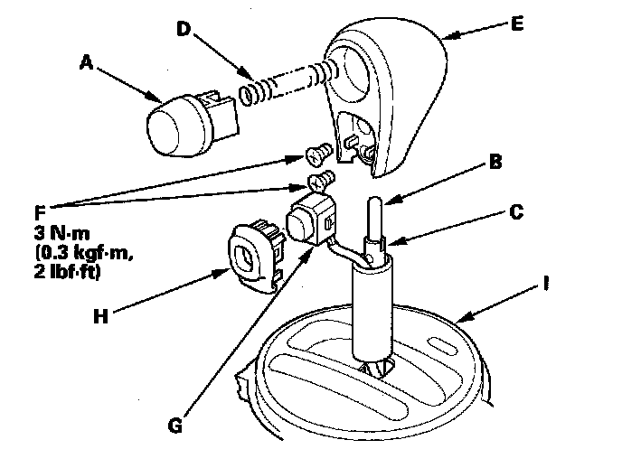25. Install the O/D switch (G) and the O/D switch cover (H), and install the A/T gear position indicator panel (I) on the shift lever bracket.