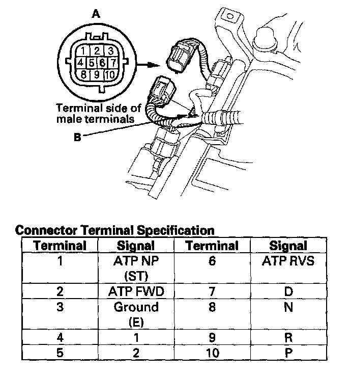 1. Remove the transmission range switch harness connector (A) from the connector bracket (B), then disconnect the connector.