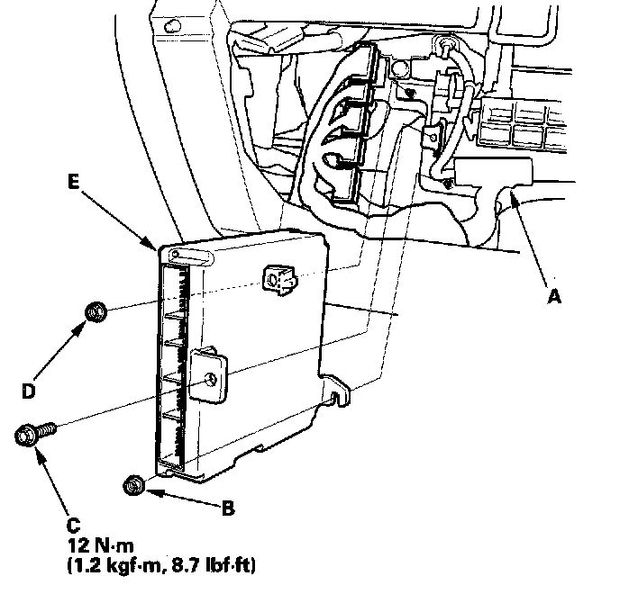 6. Loosen the mounting nut (B) on the lower right of the PCM (E), and remove the mounting bolt (C) and nut (D) on the left of the PCM.
