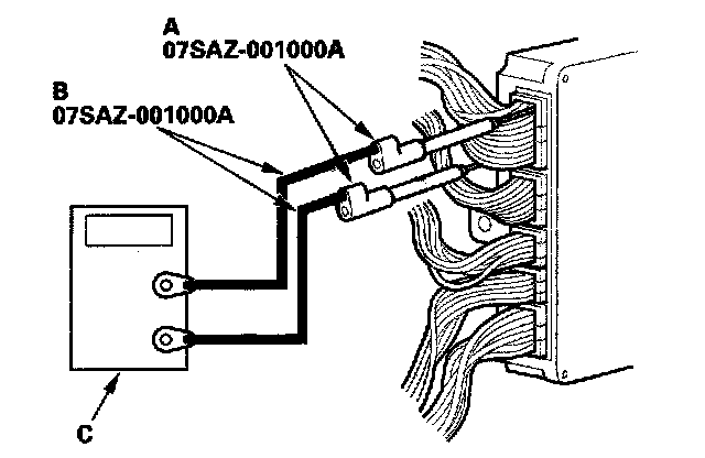 9. Connect the backprobe adapters (A) to the stacking patch cords (B), and connect the cords to a multimeter (C).