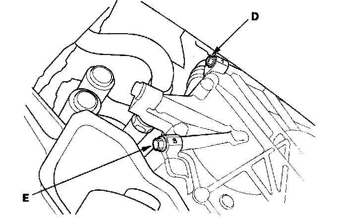 5. Connect the oil pressure gauges to the 1st clutch pressure inspection port (D) and 3rd clutch pressure inspection port (E).