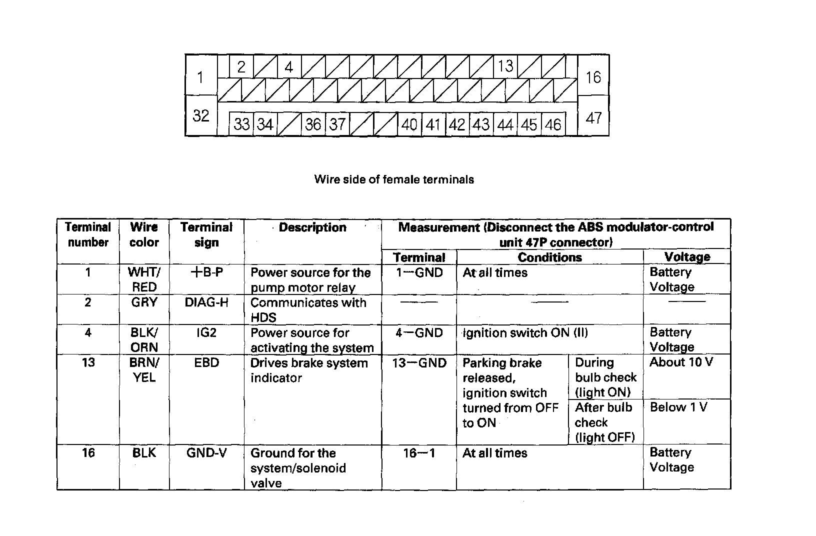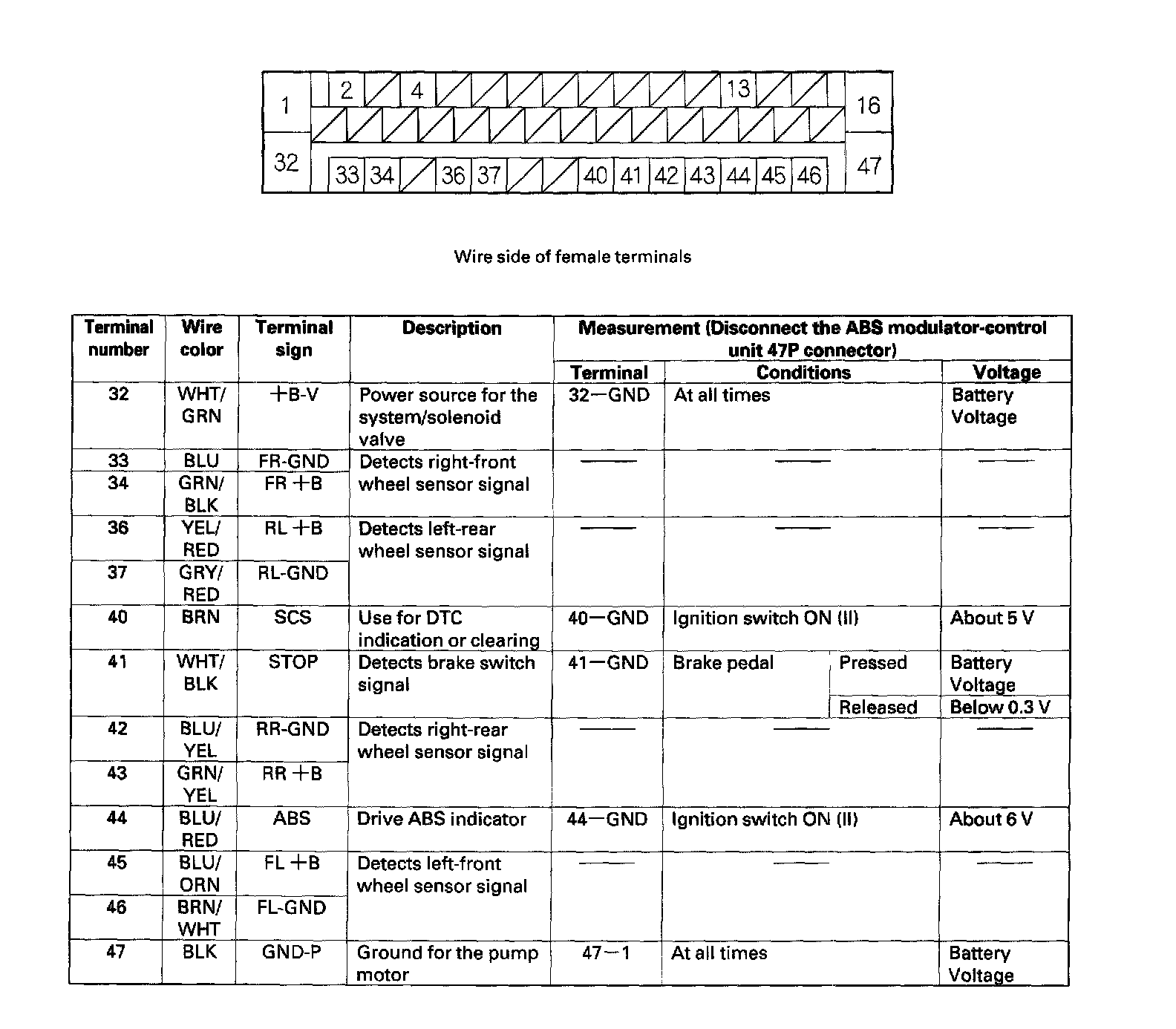 ABS Modulator-control Unit Inputs and Outputs for 47P Connector: