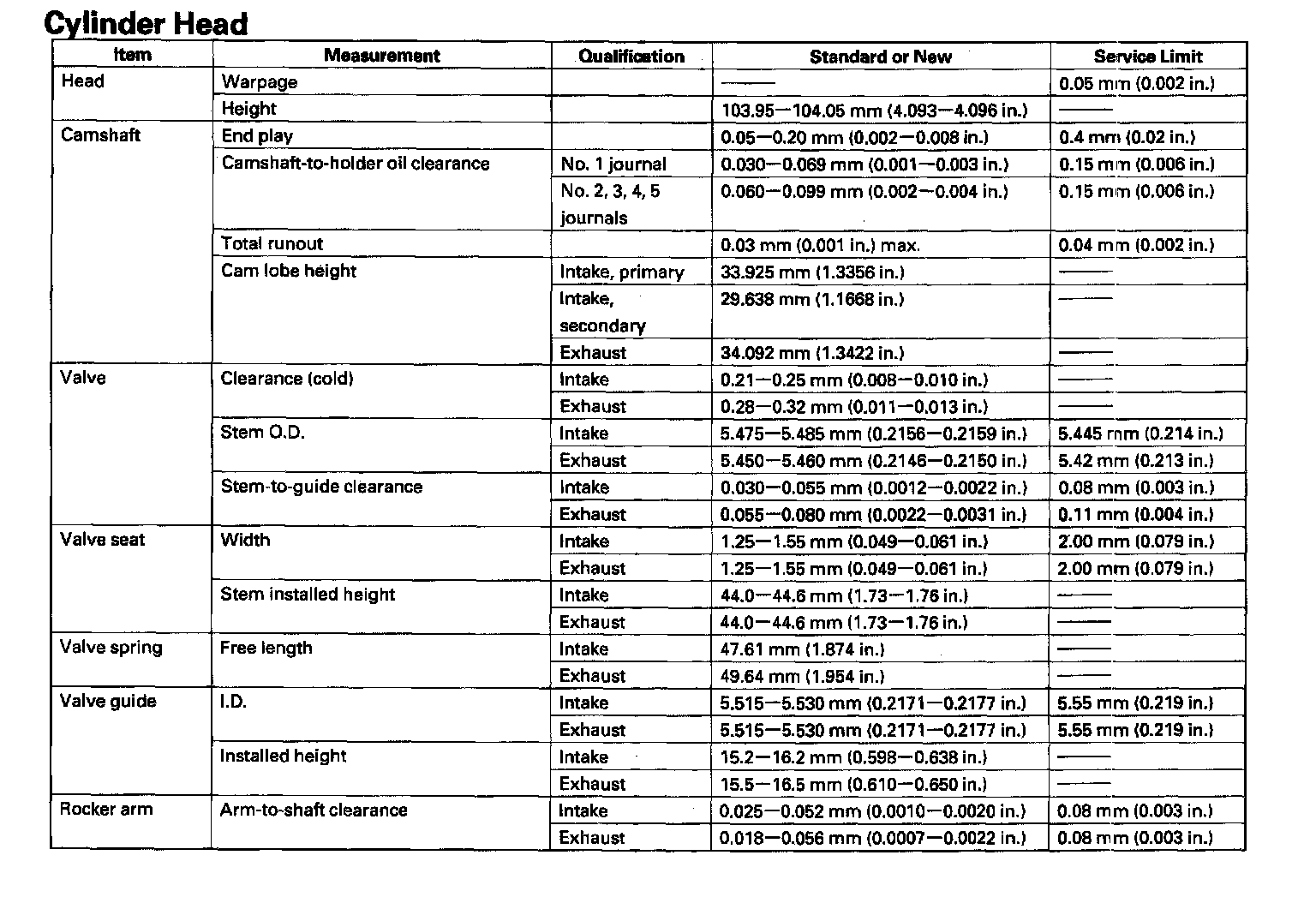 Standards And Service Limits - Cylinder Head: