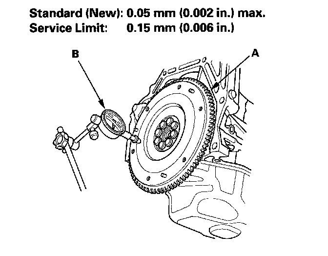 Measure the flywheel (A) runout using a dial indicator (B) through at least two full turns with the engine installed. Push against the flywheel each time you turn it to take up the crankshaft thrust washer clearance. If the runout is more than the service limit, replace the flywheel, and recheck the runout. Resurfacing the flywheel is not recommended.