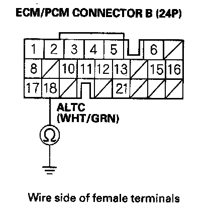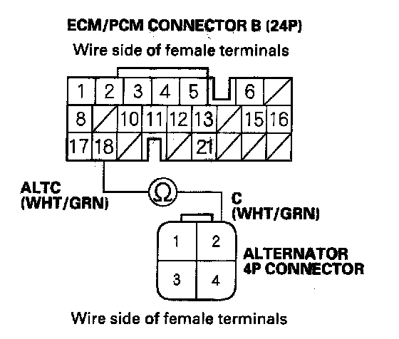 12. Check for continuity between ECM/PCM connector terminal B18 and alternator 4P connector terminal No. 2.