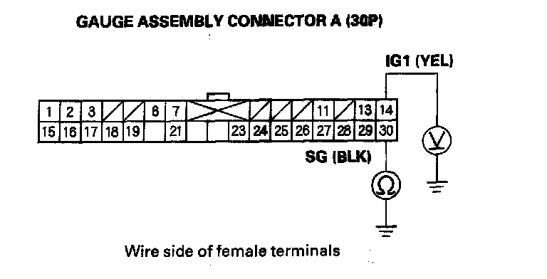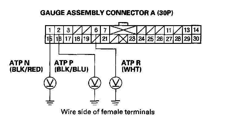 2. If the MIL does not come on, and the A/T gear position indicator P, N, or R does not come on, remove the gauge assembly from the dashboard, then disconnect gauge assembly connector A (30P).