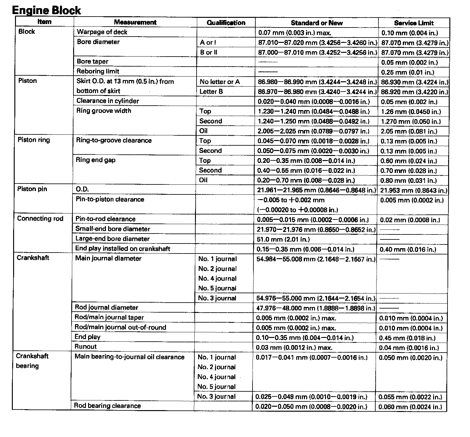 Standards And Service Limits - Engine Block: