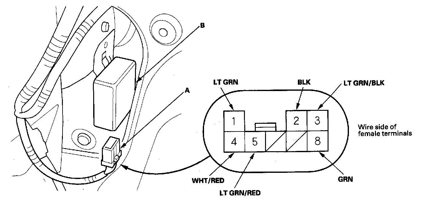 2. Disconnect the 8P connector (A) from the rear window wiper control unit (B).
