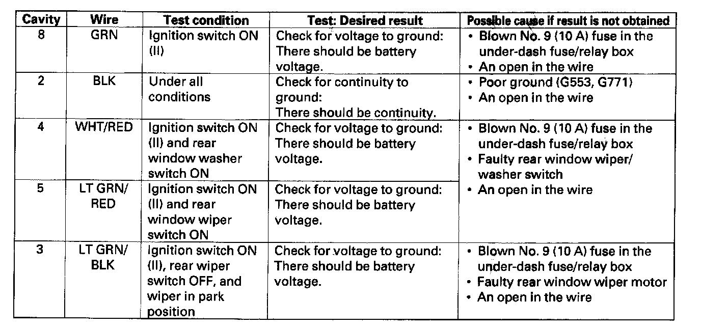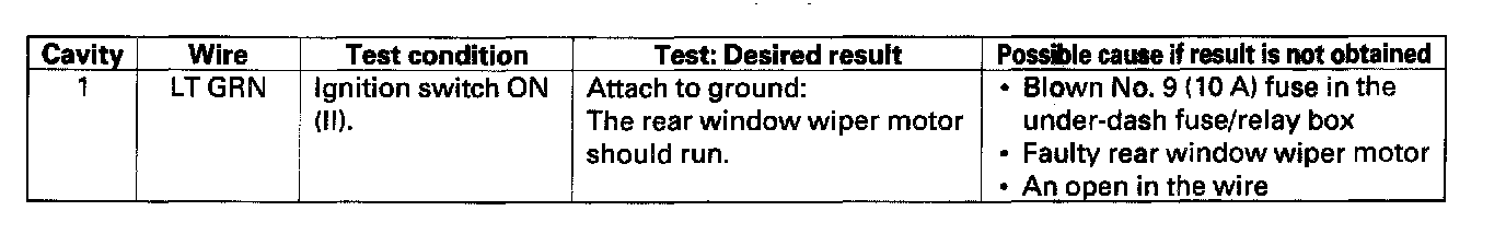 Home >> Honda >> 2006 >> Element 4WD L4-2.4L >> Repair and Diagnosis >> Wiper and Washer Systems >> Relays and Modules - Wiper and Washer Systems >> Wiper Control Module >> Testing and Inspection >> Rear Window Wiper Control Unit Input Test