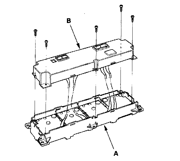 2. Remove the self-tapping screws, then carefully separate the A/C control panel display (A) from the control panel (B). Do not kink or pull on the wires between the display and the control panel. Do not touch the electronic components on the printed circuit board in the control panel.