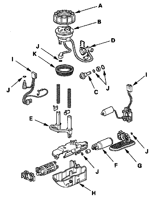 10. Remove the fuel pump (F) and suction filter (G) from the reservoir (H).