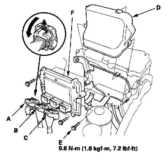 11. Remove the bolts (E), then remove the PCM (F).